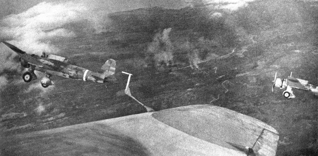 Japanese Army Air Force Mitsubishi Ki-30 (Allied code name “Ann”) bombers flying over the main line on Bataan in 1942 (Source: Wikimedia Commons).